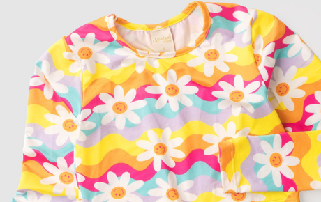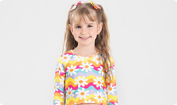 O cropped de manga longa, confeccionado em 96% poliéster e 4% elastano, proporciona proteção solar, mantendo sua filha segura nos dias ensolarados. Com uma adorável estampa de florzinhas e na cor amarela, a peça é alegre e cheia de charme.