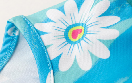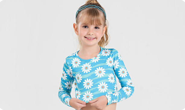 O cropped de manga longa, confeccionado em 96% poliéster e 4% elastano, oferece proteção solar, mantendo sua pequena protegida enquanto brinca. Com estampa de margaridas na cor azul, transmite alegria e charme.