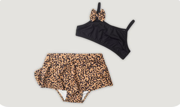 Já a calcinha com babado, que forma uma sainha, vem na cor bege com estampa sublimada de oncinha, combinando estilo e diversão na medida certa. Também possui forro para garantir conforto e segurança durante o uso.