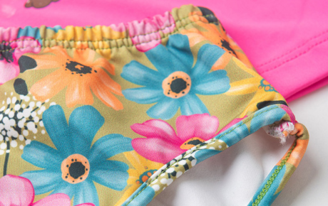 A calcinha, em tom verde, também é feita em suplex com estampa sublimada, cós com elástico que proporciona ajuste confortável e forro interno para mais segurança. Um conjunto alegre e confortável para as pequenas curtirem o verão com estilo.