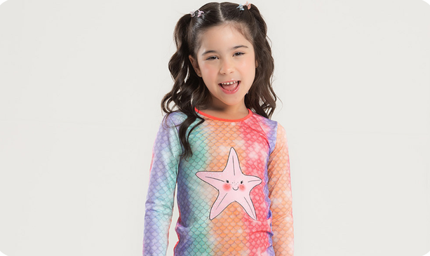 A blusa de manga longa, na cor rosa, é confeccionada em suplex 96% poliéster e 4% elastano, com estampa sublimada que traz o encanto do fundo do mar para o visual das pequenas.