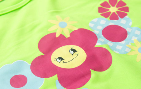 O cropped, na cor verde, é confeccionado em suplex com 96% poliéster e 4% elastano, trazendo estampa frontal alegre e mangas sublimadas com desenhos florais, perfeitas para um visual divertido e delicado.