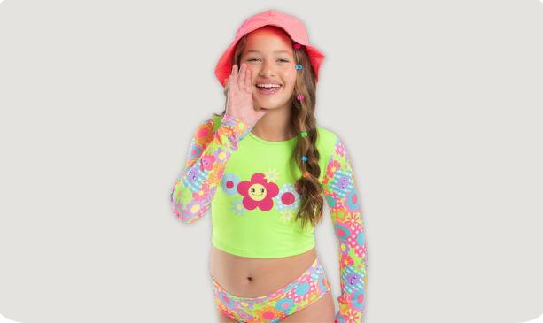 Garanta conforto, estilo e proteção para sua pequena com o Conjunto Biquíni Infantil Menina Flores Sorridentes.