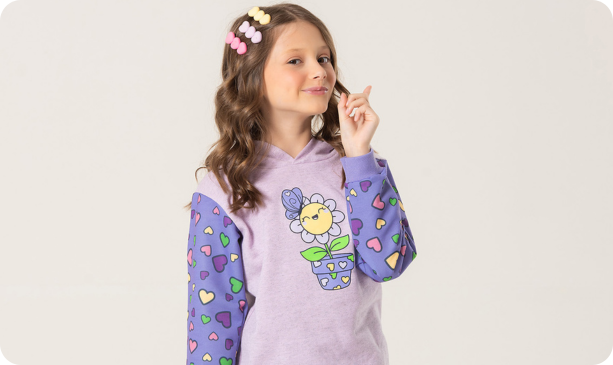 O blusão, em moletom felpado 100% algodão, conta com capuz aconchegante, mangas sublimadas que adicionam um toque divertido, além de uma estampa frontal encantadora. Os punhos e a barra em ribana garantem um ótimo caimento, tudo na cor lilás.