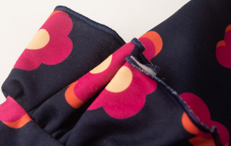 O blusão, confeccionado em moletom felpado 100% poliéster, chama a atenção pelo delicado babado na manga e pela estampa sublimada, enquanto o punho e a barra em ribana garantem um ajuste perfeito na cor marinho.