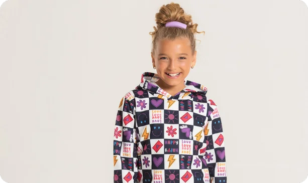 O blusão, feito em moletom com felpa 100% poliéster, possui capuz aconchegante e uma estampa sublimada de quadrinhos que traz um toque divertido e moderno. Os punhos e a barra em ribana proporcionam um ajuste confortável e seguro, na cor marinho.