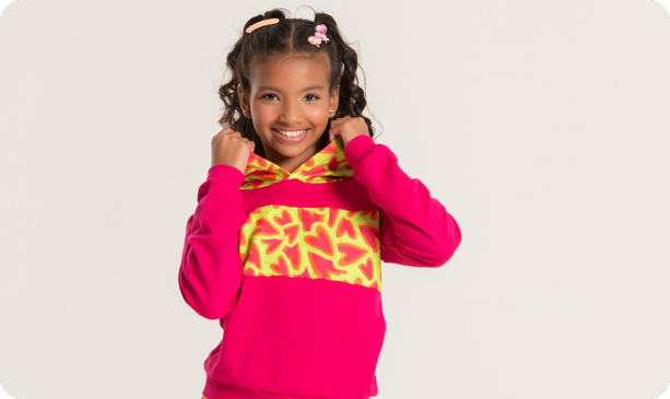 O Cropped na cor pink, confeccionado em moletom com felpa 100% algodão, destaca-se pelo recorte com estampa sublimada em poliéster e capuz sublimado, também em poliéster, trazendo um toque vibrante ao visual. Os acabamentos em ribana nos punhos e na barra proporcionam um ajuste confortável.