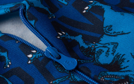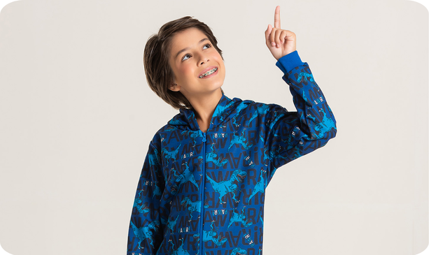 A jaqueta, confeccionada em moletom felpado 100% poliéster, vem na cor royal e traz uma estampa sublimada de dinossauro, fechamento em zíper e capuz para maior proteção. Os punhos e barra em ribana garantem um ajuste perfeito e confortável.