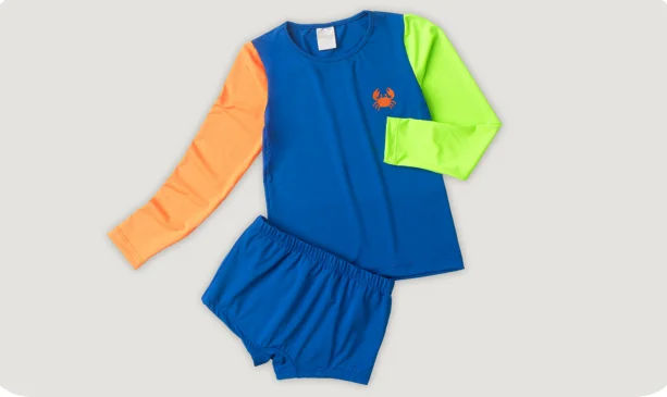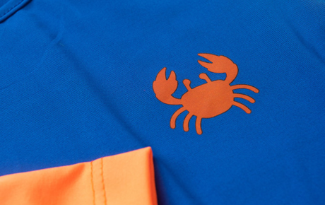 A camiseta de manga longa, confeccionada em suplex 96% poliéster e 4% elastano, combina o azul royal com mangas coloridas em laranja e verde, além de uma divertida estampa lateral de caranguejo.