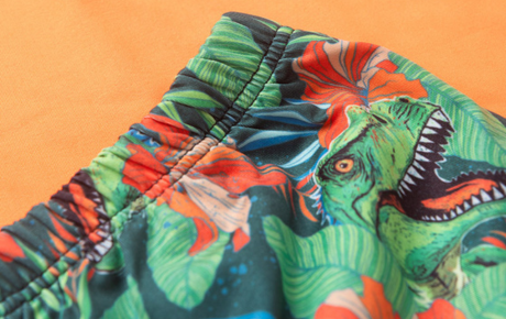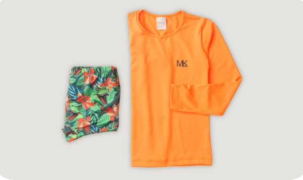 A sunga verde com estampa sublimada de dinossauros é confeccionada no mesmo material, com cós com elástico que garante ajuste perfeito e liberdade para brincar, nadar e explorar com muito estilo.