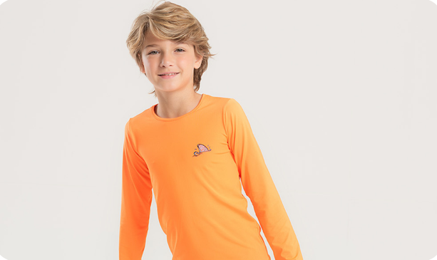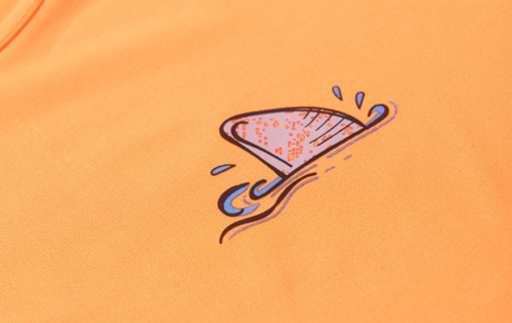 A camiseta de manga longa, na cor laranja, é confeccionada em suplex 96% poliéster e 4% elastano, com estampa lateral que remete ao universo do surf.