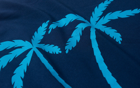 A camiseta de manga longa, na cor marinho, é confeccionada em suplex leve e resistente (96% poliéster e 4% elastano), com estampa frontal temática que remete ao clima tropical.