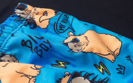 A sunga azul completa o look com estampa sublimada de capivaras e cós com elástico, proporcionando ajuste seguro e confortável para os pequenos aproveitarem os momentos na água com liberdade e estilo.