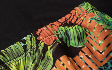 A sunga, também feita em 96% poliéster e 4% elastano, vem na cor preta com subliminação de folhagens e oferece proteção térmica solar. Ideal para dias de sol, este conjunto combina estilo e proteção para a diversão na praia.