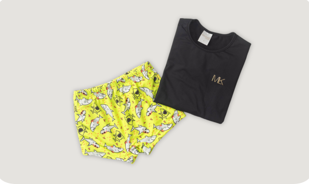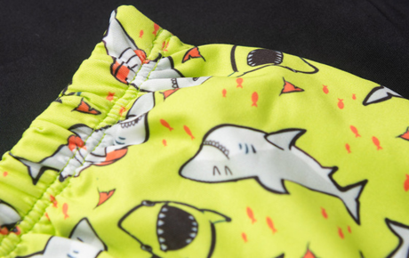 A sunga amarela, também em suplex, conta com estampa sublimada de tubarões e cós com elástico, oferecendo ajuste confortável e liberdade nos movimentos. Ideal para os pequenos curtirem a praia ou a piscina com muita diversão!