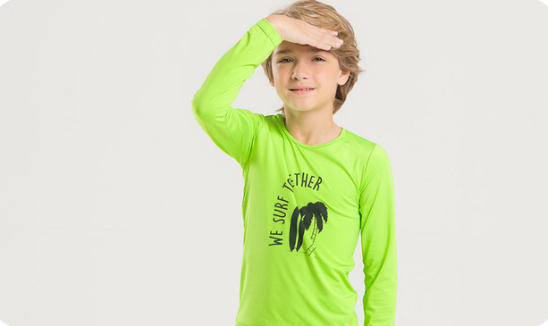 A camiseta de manga longa na cor verde é confeccionada em suplex 96% poliéster e 4% elastano, com estampa frontal inspirada no universo do surf e da praia, oferecendo leveza e liberdade para brincar.