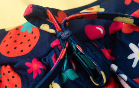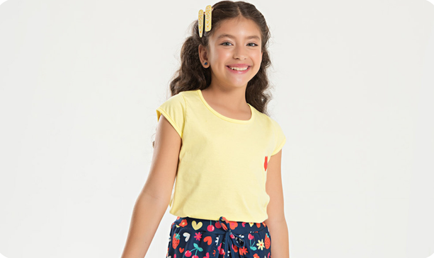 O shorts saia, na cor marinho, é feito em poliplex com 96% poliéster e 4% elastano, com estampa florida, cós com elástico para ajuste confortável e laço frontal que completa o visual com um toque gracioso. Um conjunto prático e encantador para as pequenas aproveitarem o verão com estilo.
