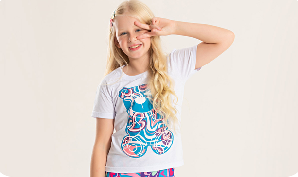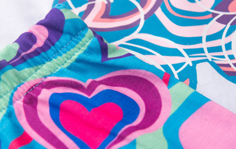 Já o shorts ciclista, confeccionado em poliplex 96% poliéster 4% elastano, em tom azul, conta com cós rebatido que garante ajuste ideal e estampa sublimada que combina com o tema delicado do look. Um conjunto leve, moderno e cheio de amor para acompanhar as pequenas em todas as aventuras do dia.