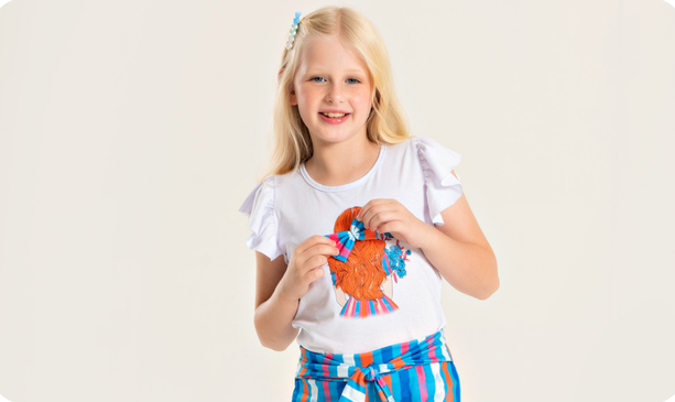 O shorts traz uma estampa listrada colorida em tecido leve (96% poliéster e 4% elastano), garantindo conforto e liberdade para as brincadeiras. O cós elástico junto com a faixa para amarração proporciona ajuste aconchegante e um charme extra no look. Com esse conjunto, qualquer passeio no parque, encontro com a família ou tarde de brincadeira ganha um toque moderno e alegre.