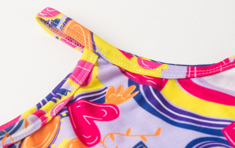 A regata alcinha, na cor lilás, é confeccionada em poliplex com 96% poliéster e 4% elastano, possui estampa sublimada divertida e babado na barra que traz leveza e charme ao look.