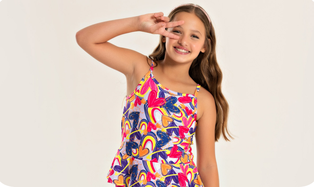 Garanta conforto e qualidade para sua criança com o Conjunto Verão Menina Regata Alcinha com Babado e Shorts Explosão de Corações.