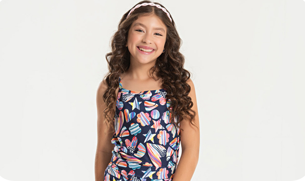 Feito em poliplex com 96% poliéster e 4% elastano, o conjunto oferece caimento leve, toque macio e muita liberdade para os dias quentes. O cropped de alcinha, na cor marinho, apresenta estampa sublimada inspirada no fundo do mar, trazendo um visual alegre e vibrante.
