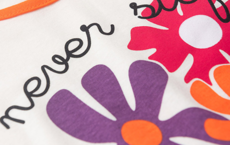 A blusa, na cor natural, é confeccionada em meia malha 100% algodão, com estampa frontal delicada e friso na manga em tom pink que dá um toque moderno ao visual.