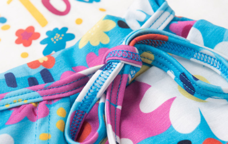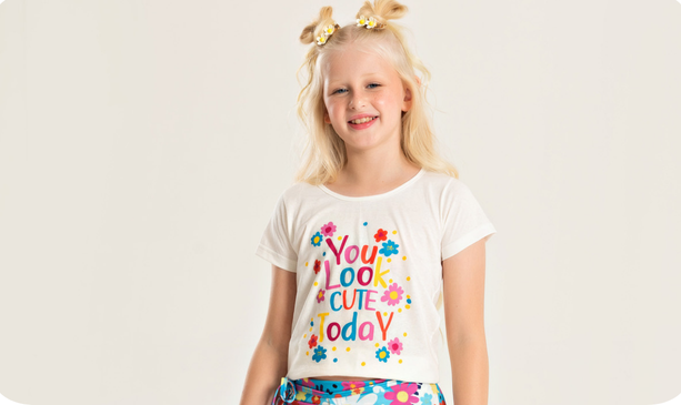 O destaque fica para o shorts saia azul, confeccionado em poliplex 96% poliéster e 4% elastano, que conta com transpasse frontal, estampa sublimada de florzinhas, cós com elástico e um charmoso laço, deixando o look ainda mais gracioso e estiloso para as pequenas aproveitarem o verão com alegria.