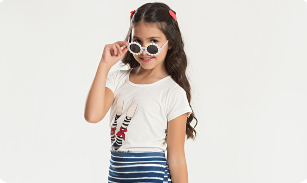 O shorts saia, em tom marinho, é feito em poliplex com 96% poliéster e 4% elastano, e conta com estampa sublimada de listras em um estilo leve e divertido. Um conjunto fresquinho e encantador, ideal para os dias de verão com muito estilo e liberdade para brincar.