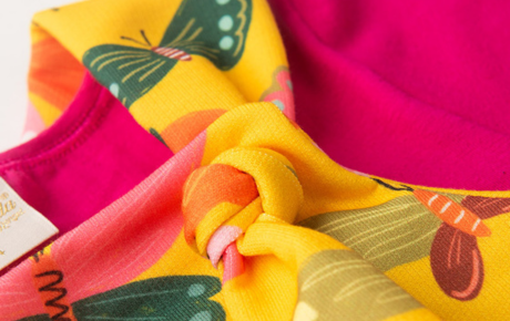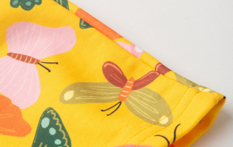 A salopete, na cor amarela, é feita em moletom sem felpa 100% poliéster, com estampa sublimada de borboletas que traz um toque lúdico e encantador ao look. Um conjunto versátil e cheio de charme para deixar as pequenas ainda mais estilosas no verão.