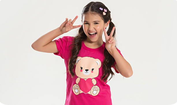 A blusa, em tom pink, é confeccionada em meia malha 100% algodão, com modelagem moderna de ombro deslocado e estampa frontal fofa que deixa o look ainda mais delicado.