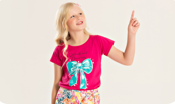A blusa, na cor pink, é confeccionada em meia malha 100% algodão, com estampa frontal charmosa que traz delicadeza ao visual.