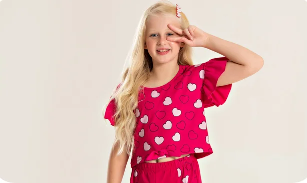 Garanta conforto e qualidade para sua criança com o Conjunto Verão Menina Cropped com Amarração e Shorts com Recorte Corações.