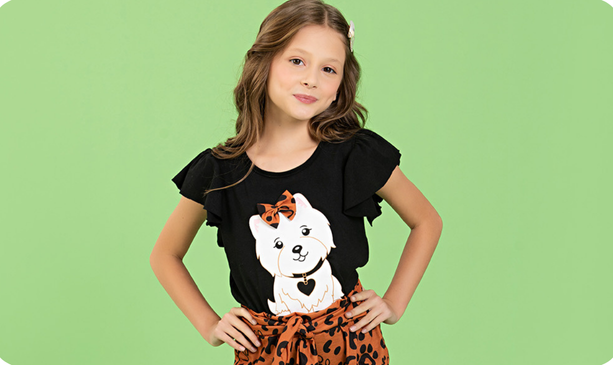 A blusa, confeccionada em meia malha 100% algodão, é leve e confortável, ideal para os dias quentes. Apresenta uma encantadora estampa frontal de cachorrinha e mangas com babado, conferindo um toque delicado e fofo. Disponível na cor preta, é fácil de combinar com diversas opções de roupas.