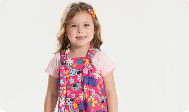 A salopete, em tom pink, é feita em moletom sem felpa 100% poliéster, com estampa sublimada alegre e delicada de joaninhas, que completa o look com um ar lúdico e encantador. Um conjunto leve e cheio de estilo para as pequenas se divertirem com conforto durante o verão.