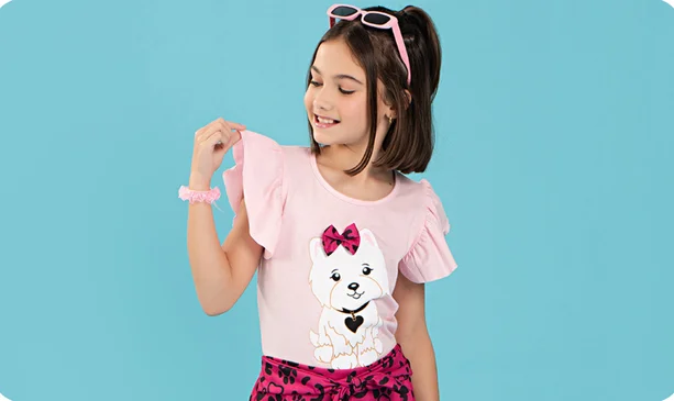 A blusa, confeccionada em meia malha 100% algodão, é leve e confortável, ideal para os dias quentes. Apresenta uma encantadora estampa frontal de cachorrinha e mangas com babado, conferindo um toque delicado e fofo. Disponível na cor rosa, é fácil de combinar com diversas opções de roupas.