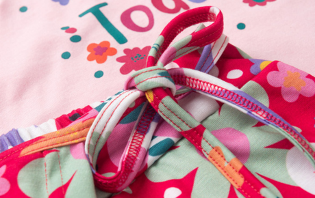 O destaque fica para o shorts saia cereja, confeccionado em poliplex 96% poliéster e 4% elastano, que conta com transpasse frontal, estampa sublimada de florzinhas, cós com elástico e um charmoso laço, deixando o look ainda mais gracioso e estiloso para as pequenas aproveitarem o verão com alegria.