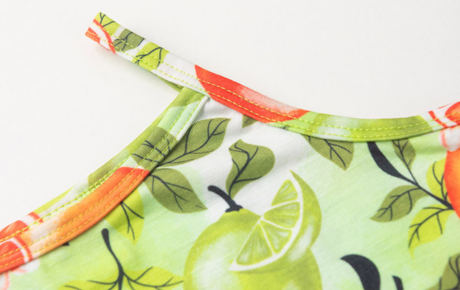 A regata de alcinha, na cor verde, é confeccionada em poliplex com 96% poliéster e 4% elastano, possui estampa sublimada de frutas e babado na barra, que adiciona leveza e charme ao visual.