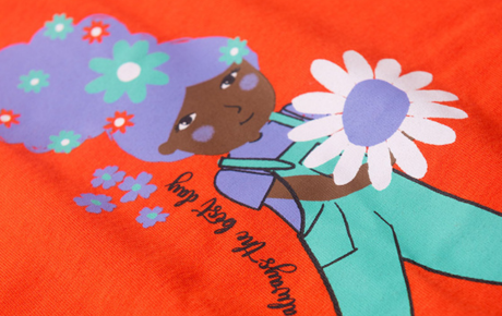 A blusa, na cor vermelha, é confeccionada em meia malha 100% algodão, com estampa frontal charmosa e mangas com babado que adicionam um toque delicado e moderno ao visual.