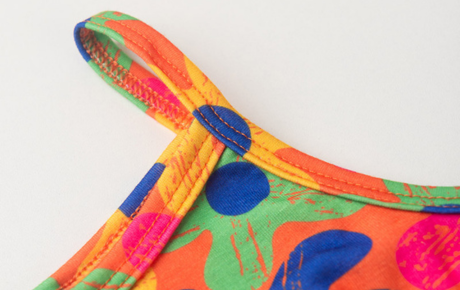 O cropped, na cor laranja, é confeccionado em poliplex com 96% poliéster e 4% elastano, com alcinhas e babado na barra que adiciona leveza e delicadeza ao look.