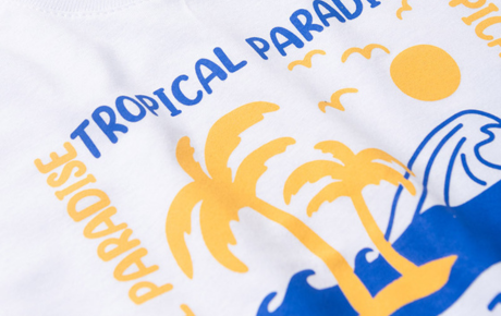 A camiseta, na cor branca, é confeccionada em meia malha 100% algodão, garantindo leveza e conforto, com estampa frontal inspirada em paraísos tropicais e reforço na gola para maior durabilidade.