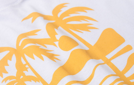A camiseta, na cor branca, é confeccionada em meia malha 100% algodão, com estampa frontal inspirada nos coqueiros de Los Angeles, e reforço na gola para maior durabilidade.