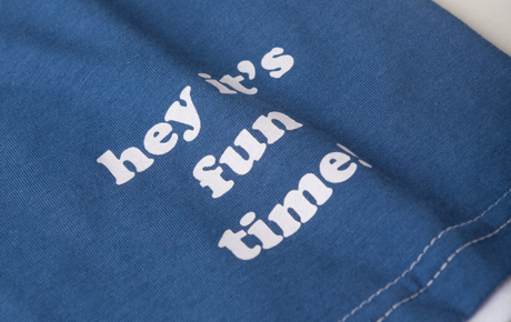 A camiseta é confeccionada em meia malha 100% algodão, com recortes nas cores branco, denim e noturno, além de uma estampa localizada que complementa o visual.