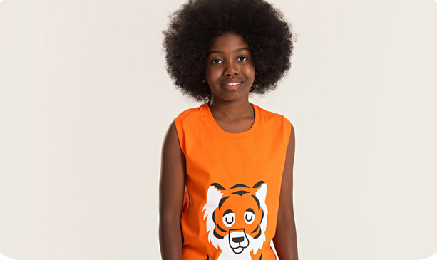 Feita em meia malha 100% algodão, a regata laranja entrega toque macio e excelente respirabilidade ideal para os dias de calor. O destaque, claro, é a estampa frontal de tigre que além de moderna, é também divertida e perfeita para despertar a imaginação dos pequenos exploradores. Além disso, o reforço na gola ajuda a manter o visual alinhado, mesmo com o uso constante