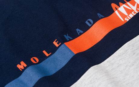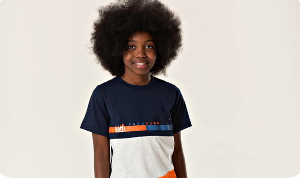 A camiseta, confeccionada em meia malha 100% algodão, possui recortes nas cores marinho, mescla e vitamina, estampa frontal moderna e reforço na gola, garantindo durabilidade e conforto durante o uso.
