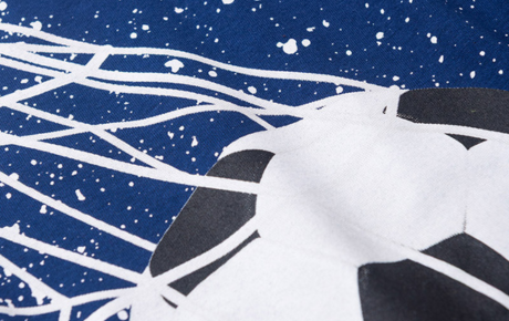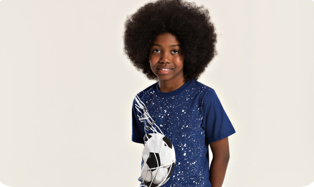 A camiseta, na cor marinho, é confeccionada em meia malha 100% algodão, com estampa frontal temática de bola e reforço na gola, proporcionando conforto e resistência para o uso diário.