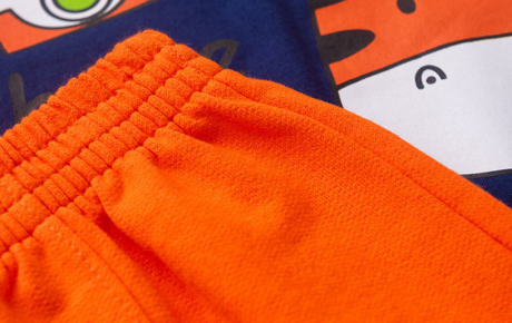 A bermuda, em tom laranja, é feita em moletom careca 100% algodão, com recorte diferenciado e pesponto aparente que adiciona estilo ao visual. Um conjunto leve, alegre e cheio de personalidade para os dias de verão.