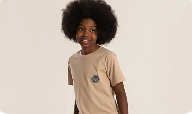 A camiseta marrom é confeccionada em meia malha 100% algodão, proporcionando toque macio e respirabilidade ideal para o verão. Seu design moderno inclui estampa lateral que adiciona personalidade ao visual, e a gola reforçada oferece maior durabilidade, acompanhando o ritmo ativo das crianças. Além disso, a peça também é leve, permitindo que o pequeno se movimente com facilidade e conforto, sem perder estilo.