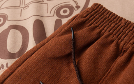 A bermuda, em marrom escuro, é feita em moletom careca 100% algodão, possui cós com elástico e cadarço para ajuste prático, além de recorte com bolso e pesponto aparente que adiciona um toque moderno ao visual. Um conjunto leve, versátil e perfeito para os meninos curtirem o verão com liberdade e estilo.