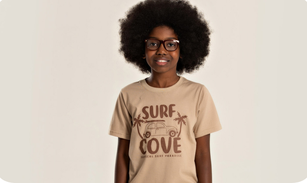 A camiseta, na cor marrom claro, é confeccionada em meia malha 100% algodão, com estampa frontal estilosa e reforço na gola, garantindo durabilidade e conforto durante o uso.